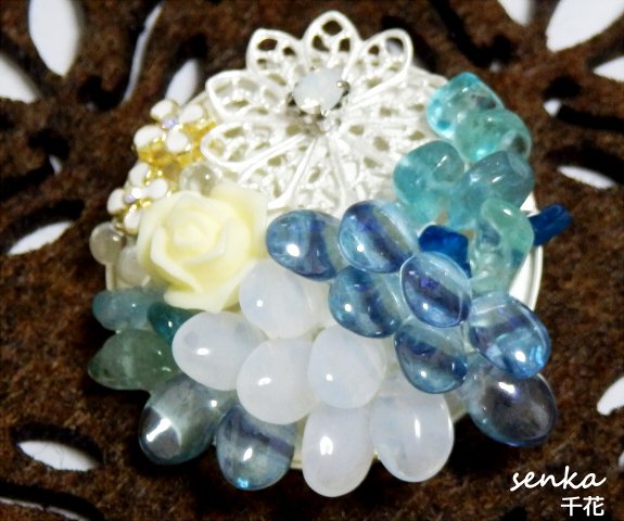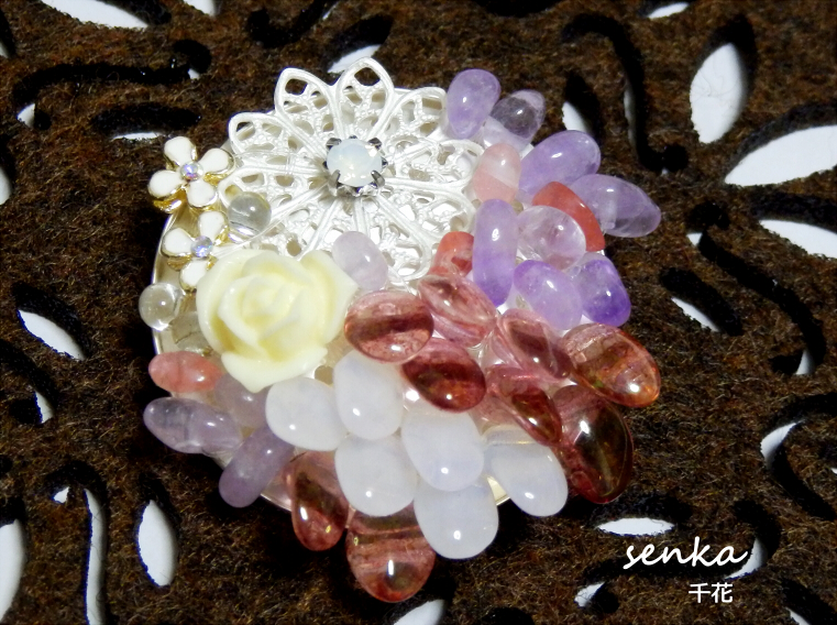 蒼氷結と桜氷結という名前で作成しました。銀色ベースのブローチにアパタイトやアメジスト、他にもスワロフスキーなどをあしらって作成しています。